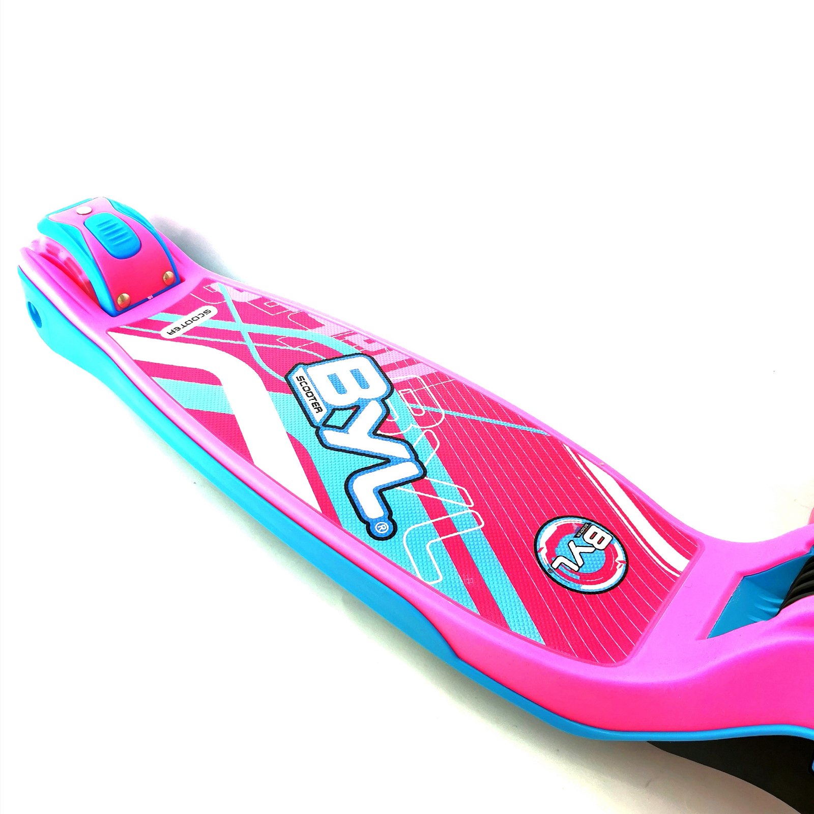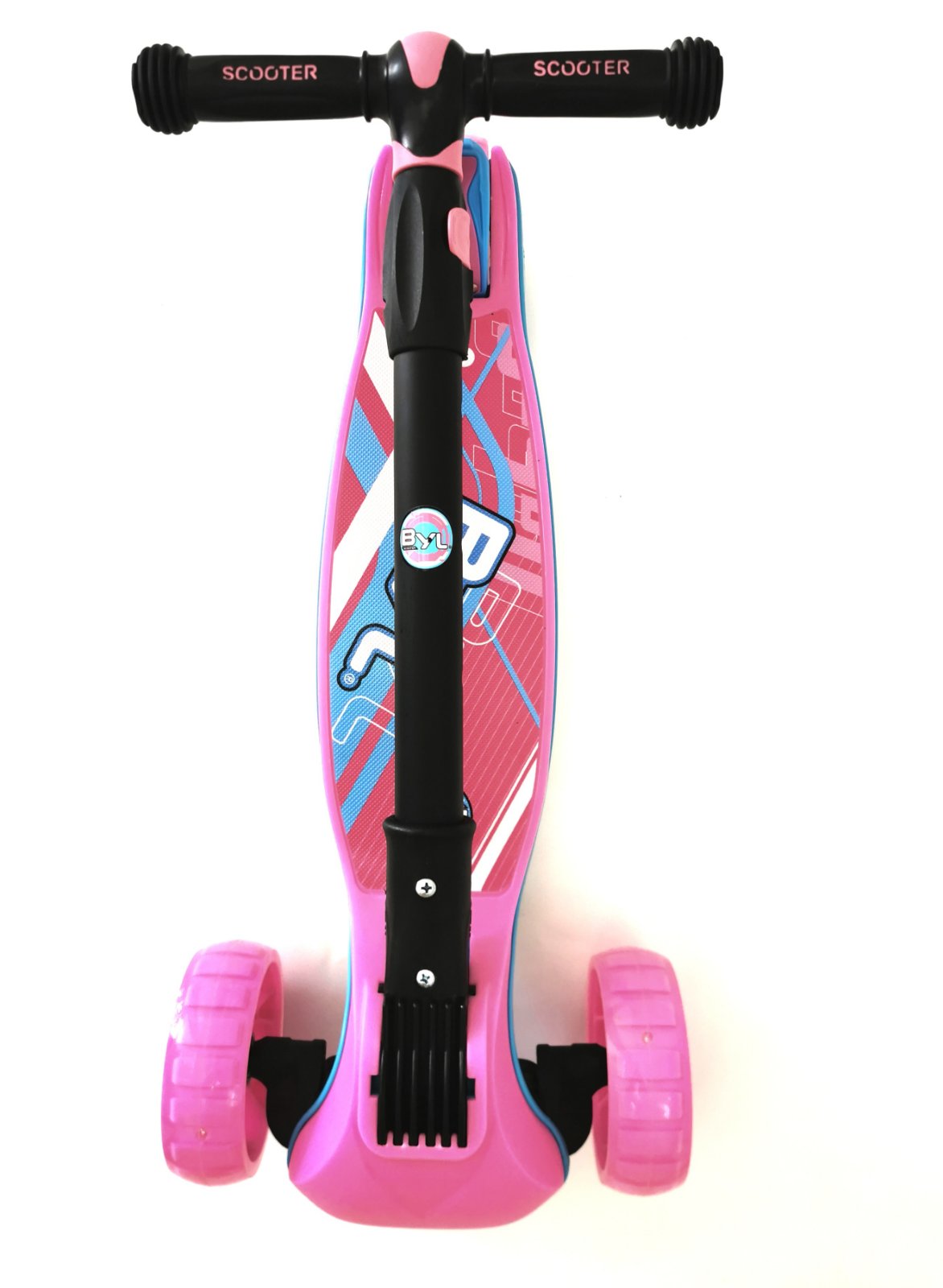 Mecanism din aluminiu pentru plierea ușoară a ghidonului fără scule. Reglarea înălțimii mânerului: 62-82 cm, cu blocare dublă. Două roți frontale mari iluminate de 12 cm pentru o stabilitate mai bună. 2 roți din spate 8 cm, cu frână. Greutatea maximă a platformei: 90 kg. Sistem brevetat de protecție în caz de răsturnare.